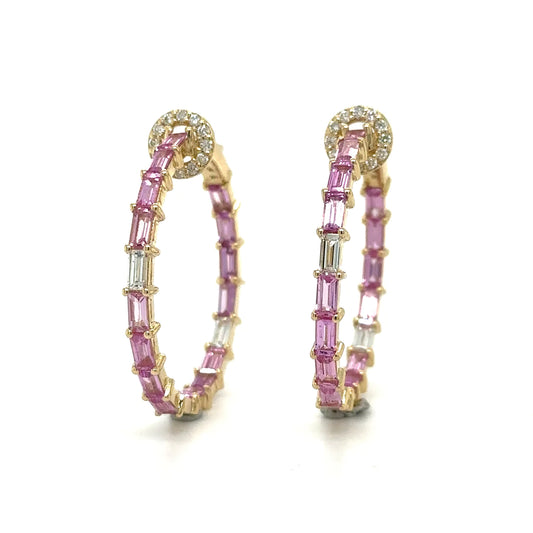 14k Yellow Gold Pink Sapphire and Diamonds Hoop Earing