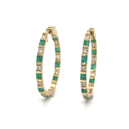 14k Yellow Gold Emerald and Diamond Hoop Earring