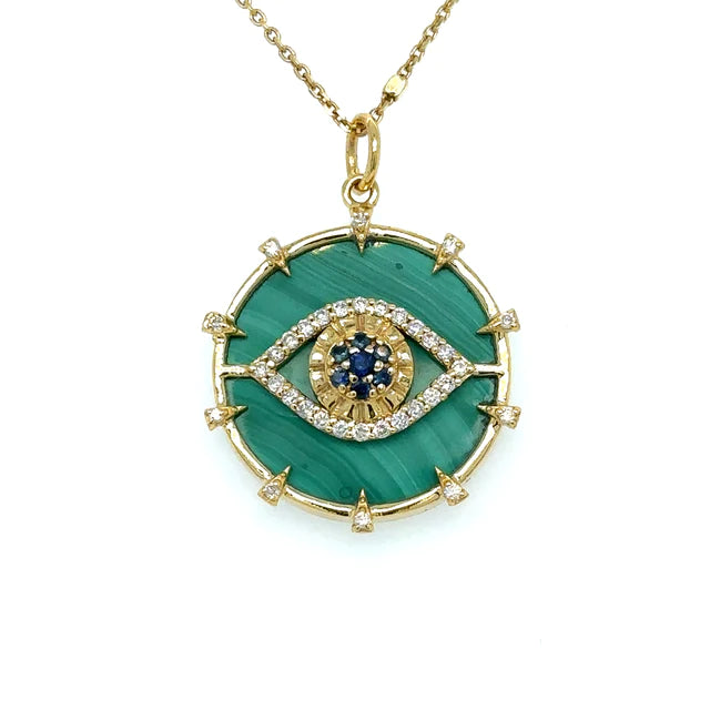 14kt Yellow Gold Malachite Evil Eye Pendent With Blue Sapphire and Diamonds